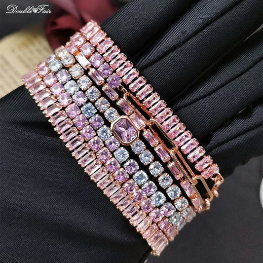 Romantic Pink Crystal Tennis Bracelets for Female Women Trend Shiny Zirconia Adjustable Folding Buckle Chain on Hand Jewelry